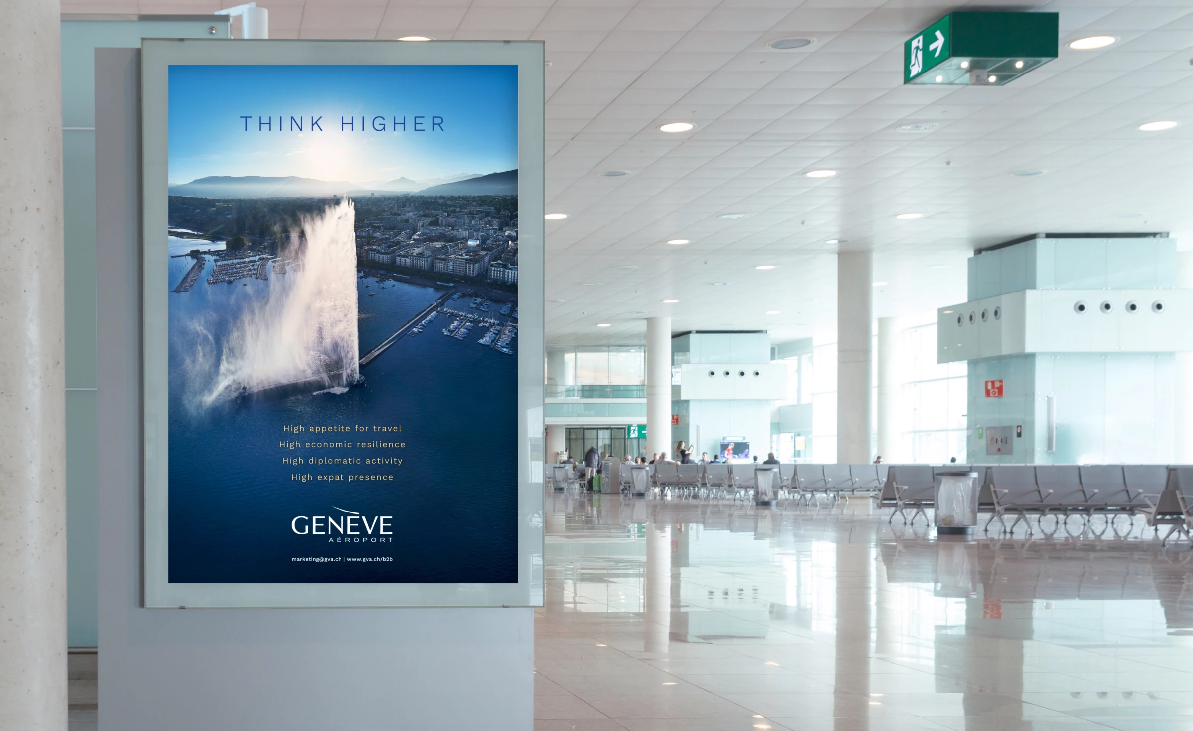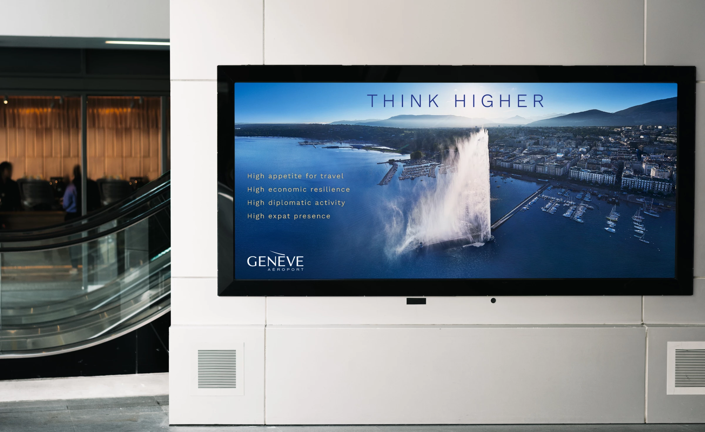L'objectif de cette campagne B2B était d'attirer les compagnies aériennes internationales, principalement celles des régions d'Asie et d'Amérique du Sud. Le slogan "Think higher" a permis de mettre en avant de manière habile les atouts de Genève.