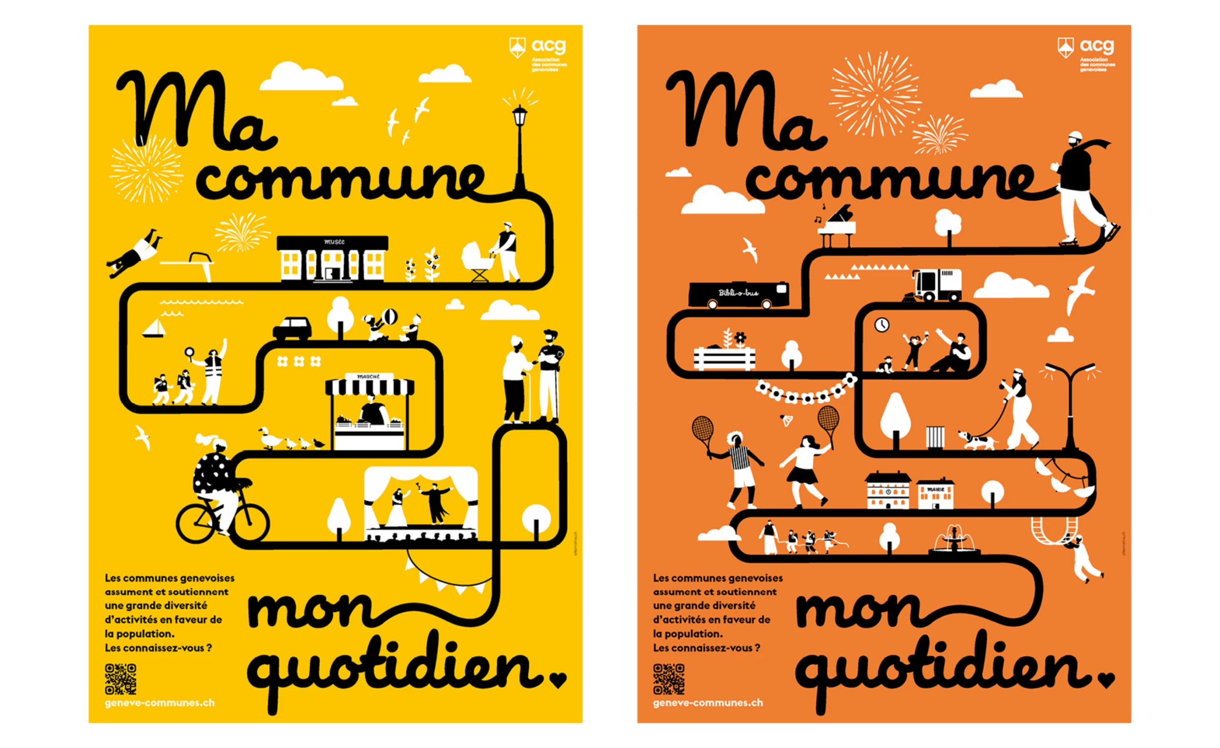 L’Association des Communes Genevoises (ACG) souhaitait mettre en lumière le soutien et le financement des activités qu'assument les communes genevoises. Les visuels mettent en scène la vie quotidienne à travers des illustrations qui donnent une tonalité humaine et chaleureuse à la campagne.