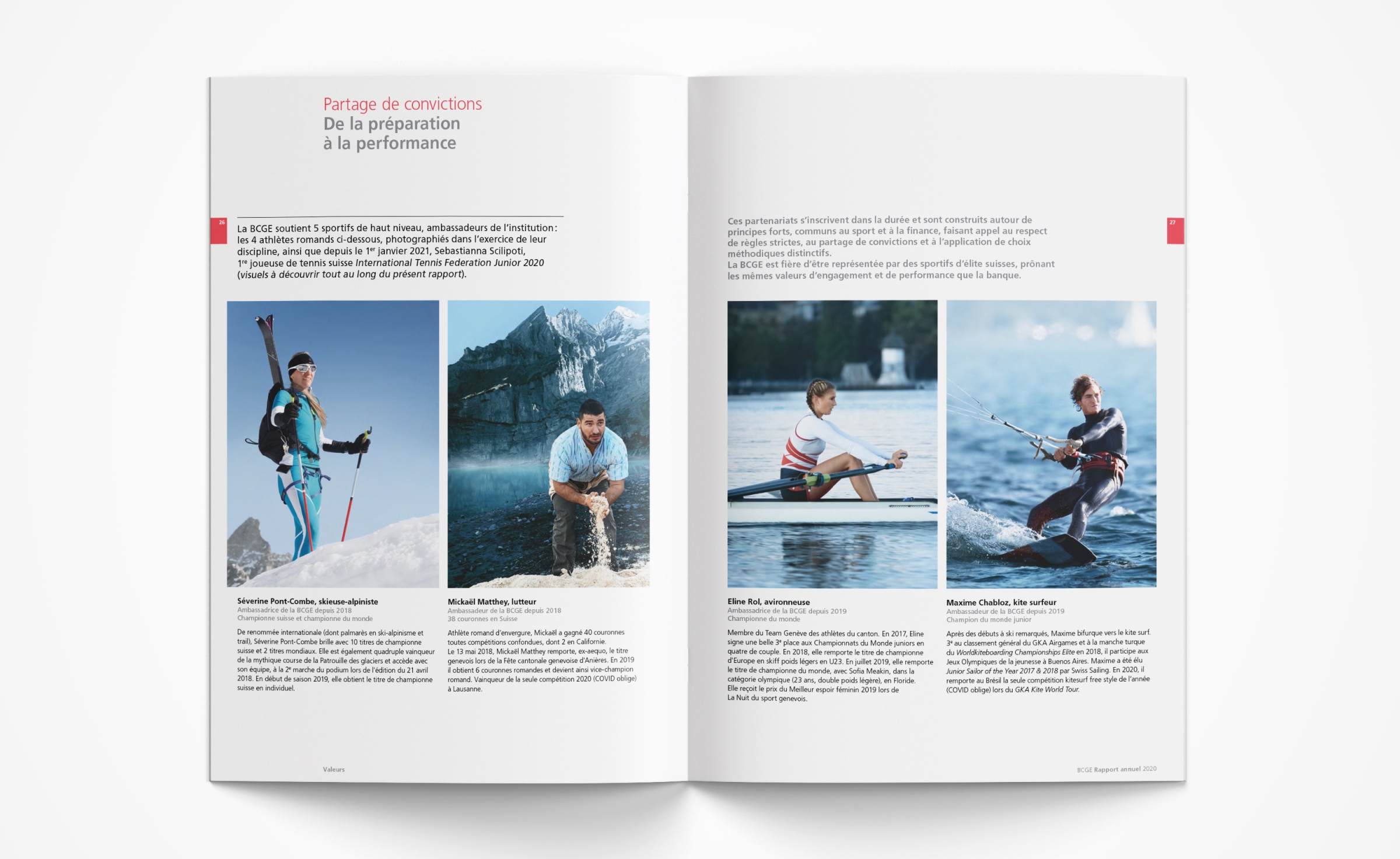 La Banque Cantonale de Genève publie chaque année son rapport d'activité et financier. Nous l'accompagnons dans la mise en page de ce document et la mise en valeur des contenus. Nous concevons également des visuels qui viennent rythmer le document et communiquer sur diverses thématiques liées à l'institution.