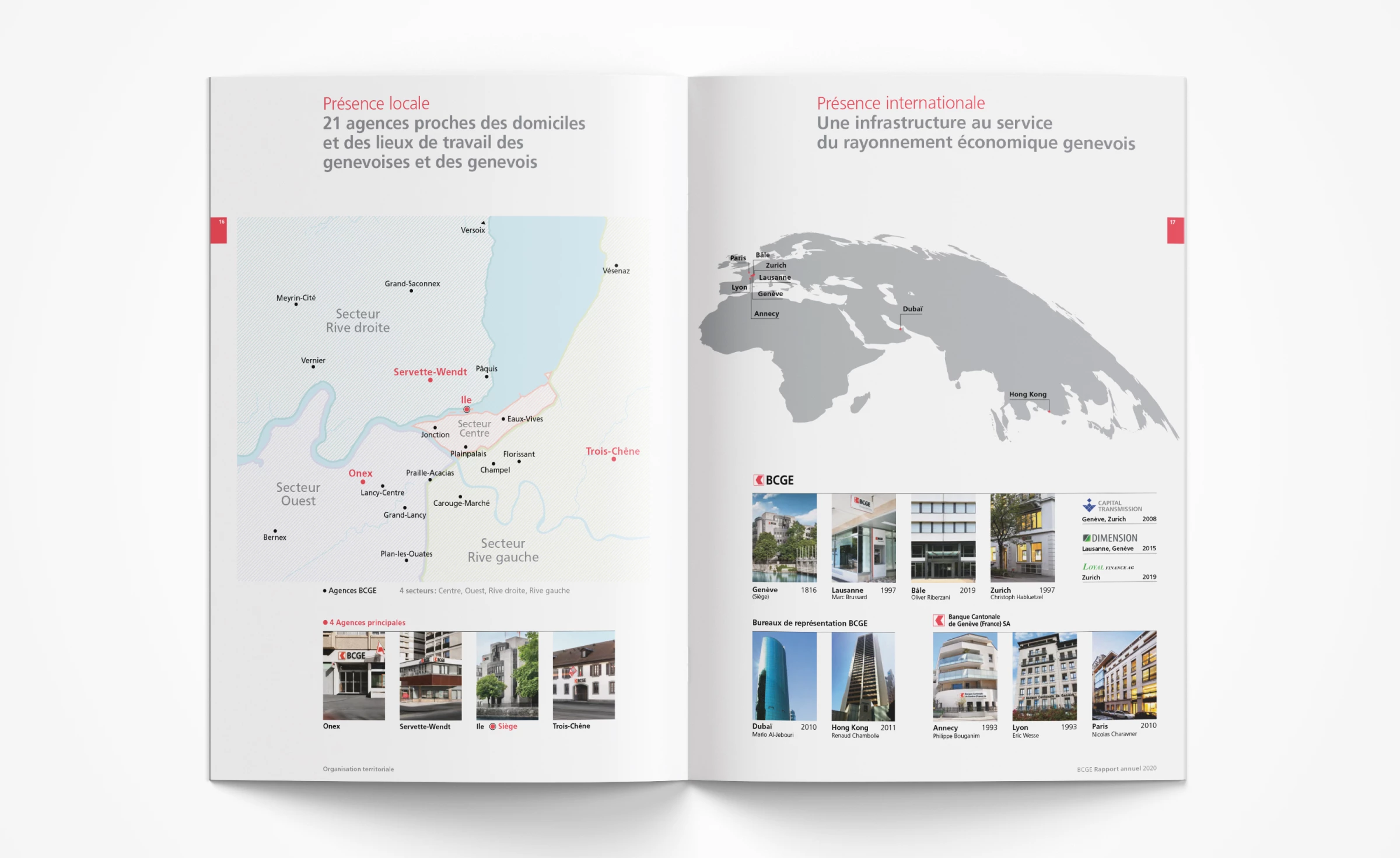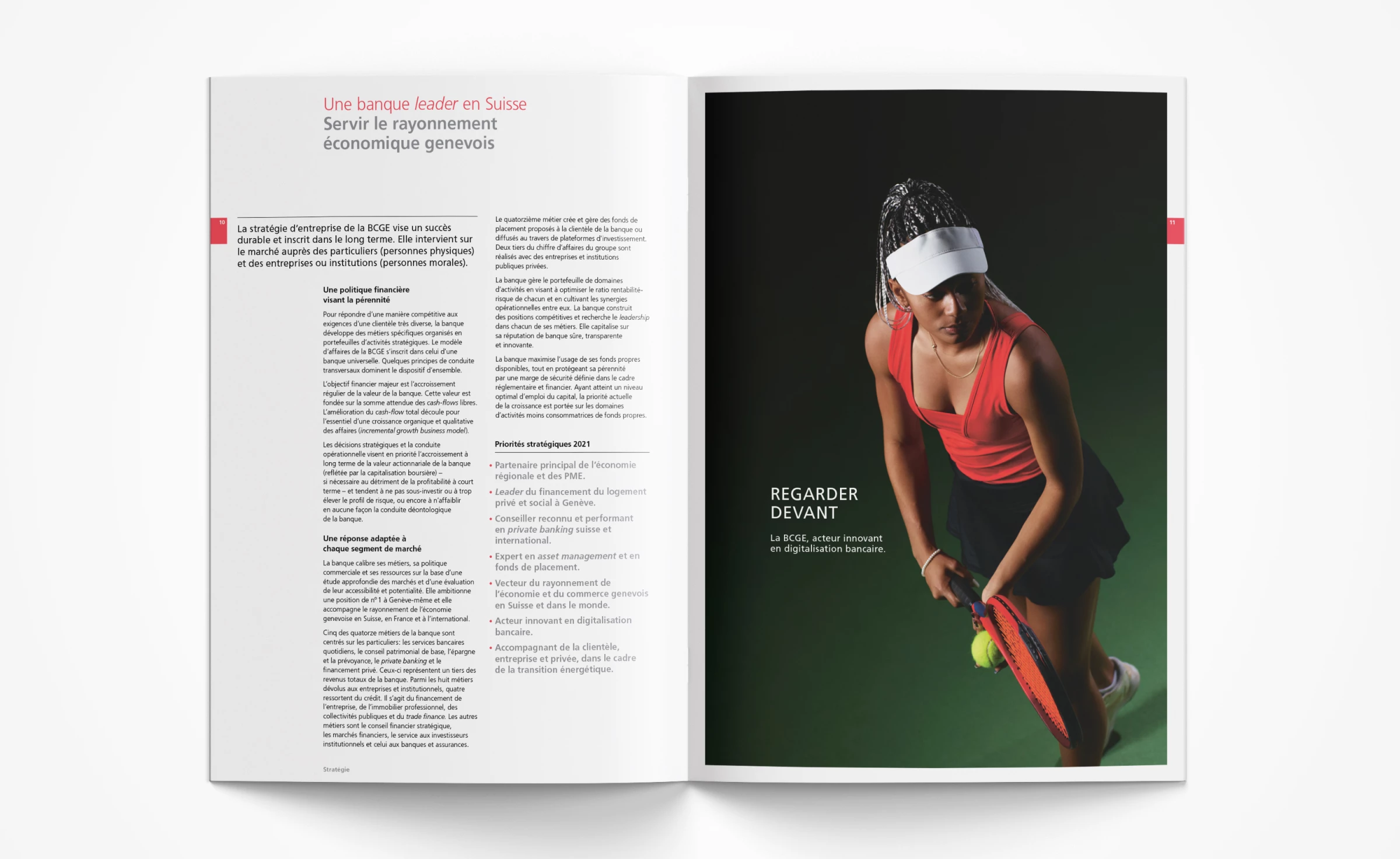 La Banque Cantonale de Genève publie chaque année son rapport d'activité et financier. Nous l'accompagnons dans la mise en page de ce document et la mise en valeur des contenus. Nous concevons également des visuels qui viennent rythmer le document et communiquer sur diverses thématiques liées à l'institution.