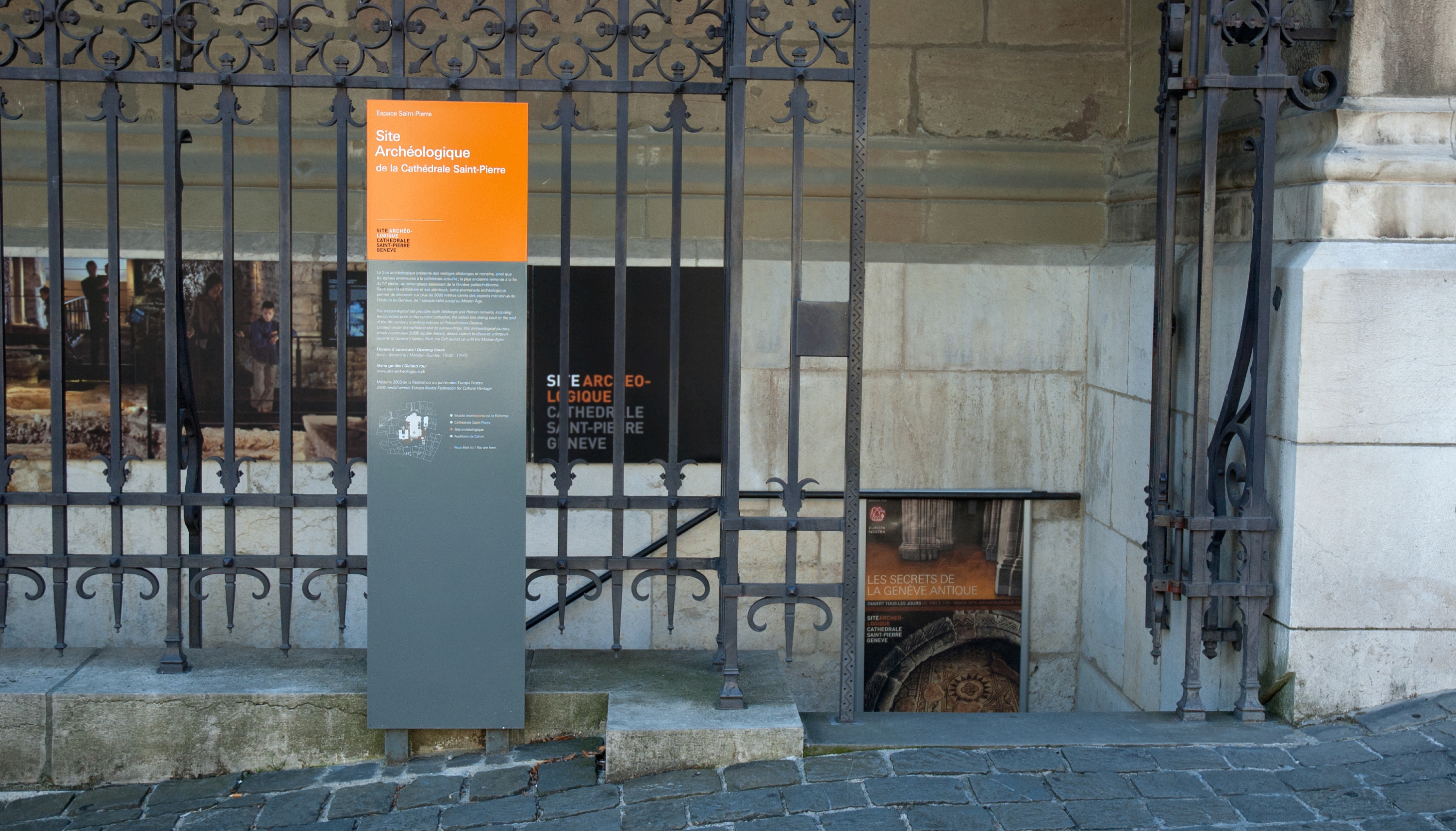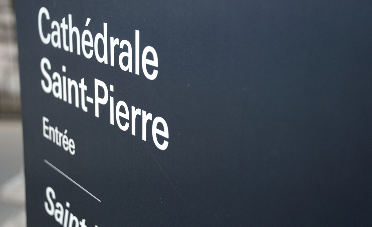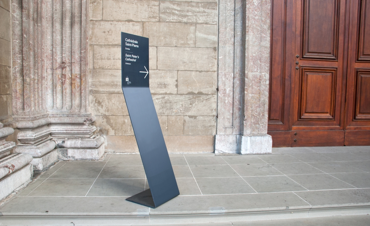 Symbole de la cité de Calvin, la Cathédrale Saint-Pierre avait besoin d'éléments directionnels pour guider les nombreux visiteurs du site. La signalétique intérieure a été réalisée avec de plaques métalliques pliées et des inscriptions en sérigraphie. De présentation sobre elle s'intègre parfaitement à l'architecture du bâtiment. Pour l'extérieur et l'Espace St-Pierre, les plaques ont été fixées au sol sur les mêmes dimensions et la même identité graphique.