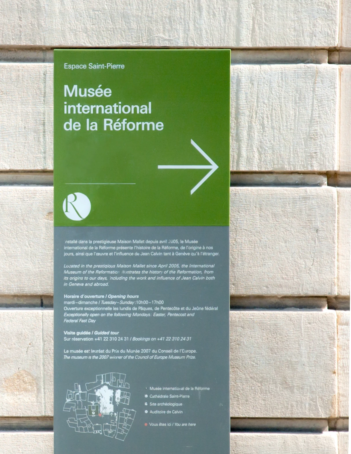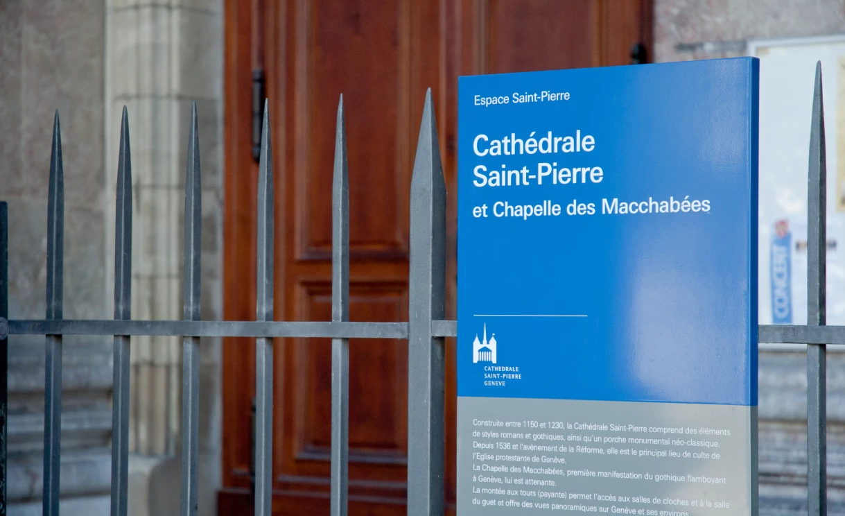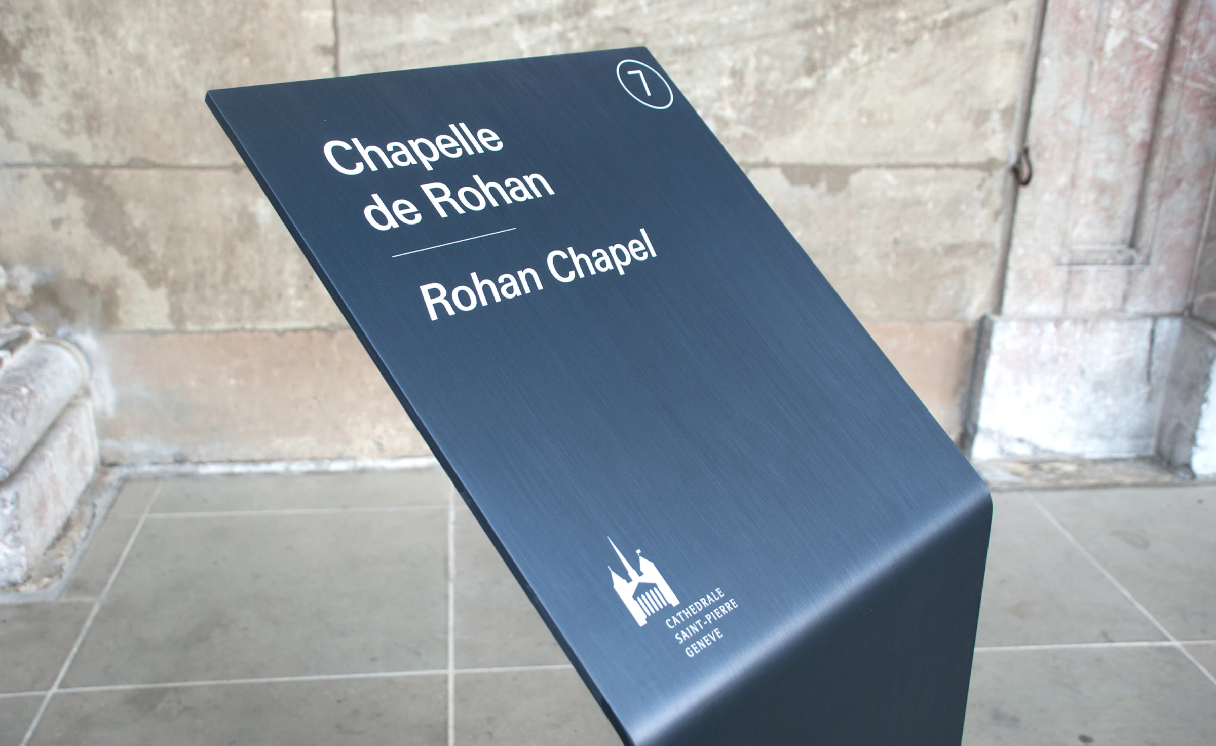 Symbole de la cité de Calvin, la Cathédrale Saint-Pierre avait besoin d'éléments directionnels pour guider les nombreux visiteurs du site. La signalétique intérieure a été réalisée avec de plaques métalliques pliées et des inscriptions en sérigraphie. De présentation sobre elle s'intègre parfaitement à l'architecture du bâtiment. Pour l'extérieur et l'Espace St-Pierre, les plaques ont été fixées au sol sur les mêmes dimensions et la même identité graphique.