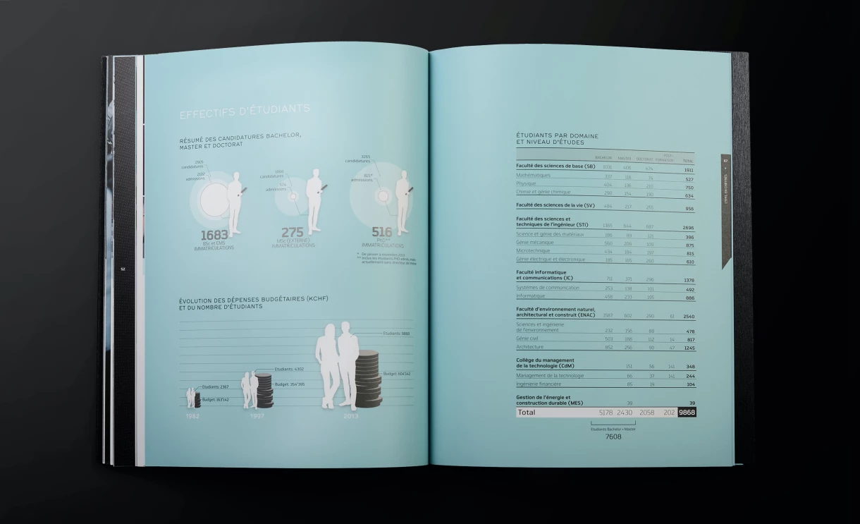Le rapport annuel est un document phare de l'École Polytechnique Fédérale de Lausanne. En effet, à travers l'année écoulée, il permet de communiquer l'actualité dense et dynamique de l'institution dans le domaine de la recherche, l'innovation et l'enseignement. Notre mission était d'une part de vulgariser l'information pour la rendre accessible et d'autre part d'exprimer le haut niveau d'exigence de cette école. Nous avons réalisé les rapports de 2009 à 2017.