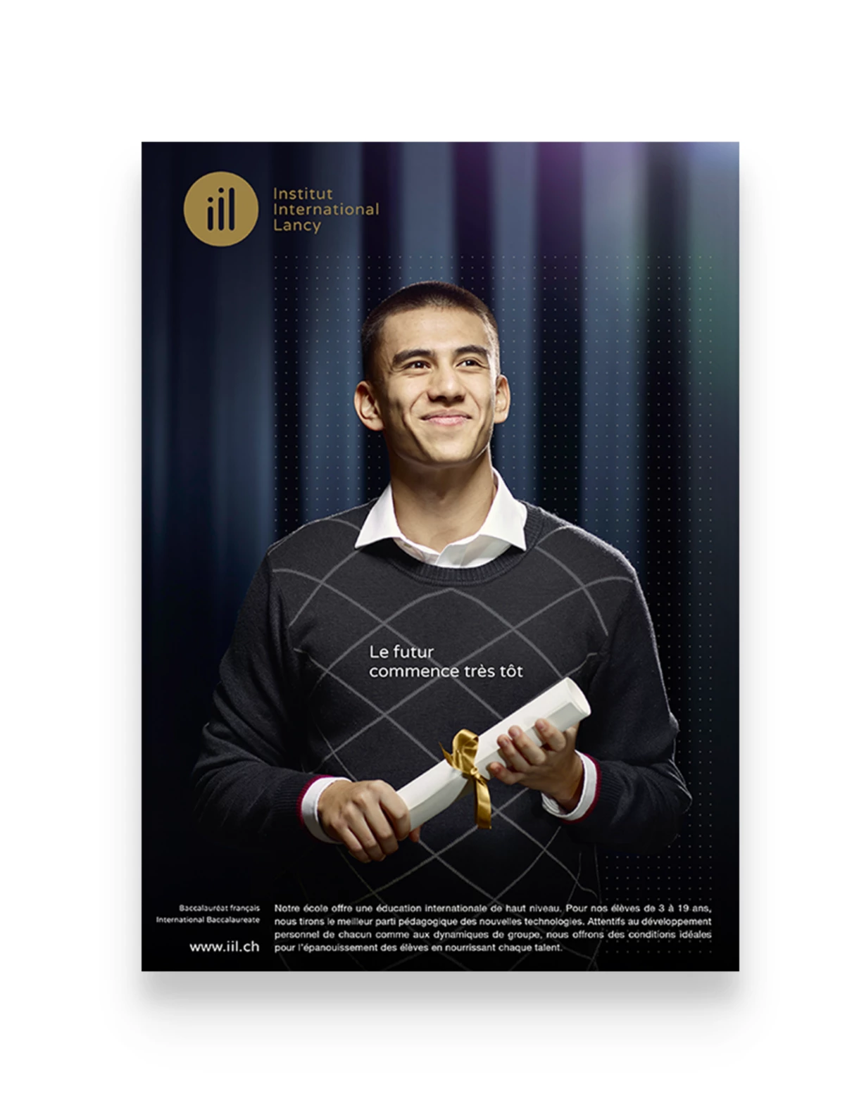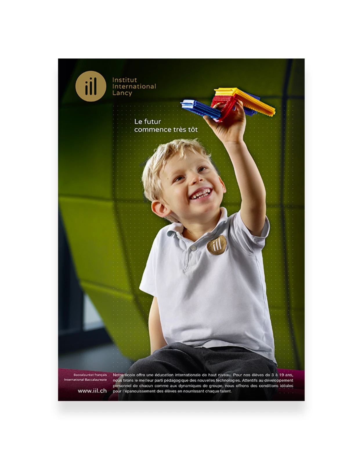 Dans sa dynamique de développement et profitant de la construction d'un nouveau bâtiment d'enseignement sur son campus, l'Institut International de Lancy (IIL) nous a mandaté pour créer sa nouvelle identité visuelle. Ce travail de rebranding a été effectué avec une vision globale allant des supports de communication à la signalétique du bâtiment. Enfin une campagne institutionnelle a été réalisée avec un déploiement à 360°.