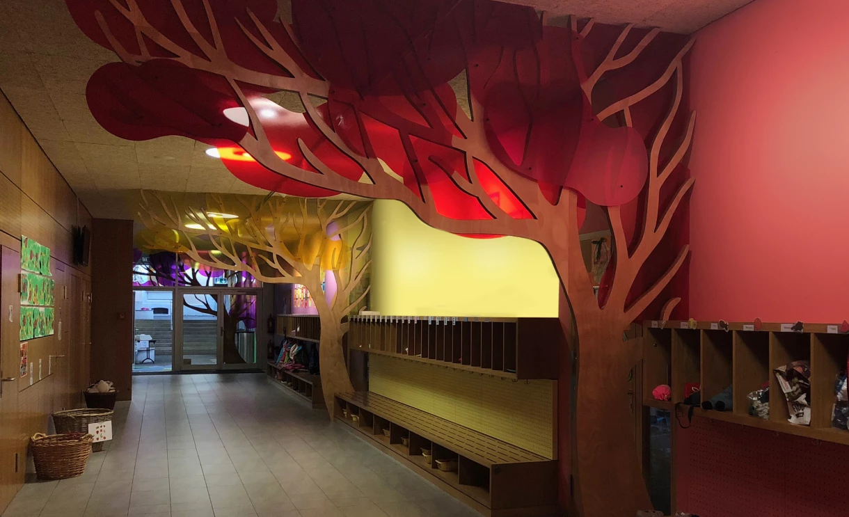 L'institut International de Lancy repense de manière colorée et féerique l’espace scolaire dédié aux élèves de 3 à 6 ans suivant le programme "IIL Start". Le parcours scénographié commence à l'extérieur du bâtiment, le ruisseau nous guide dans un univers coloré jusqu'à l'entrée de l'école. Des arbres rythment le couloir principal et créent une atmosphère magique pour les jeunes élèves.