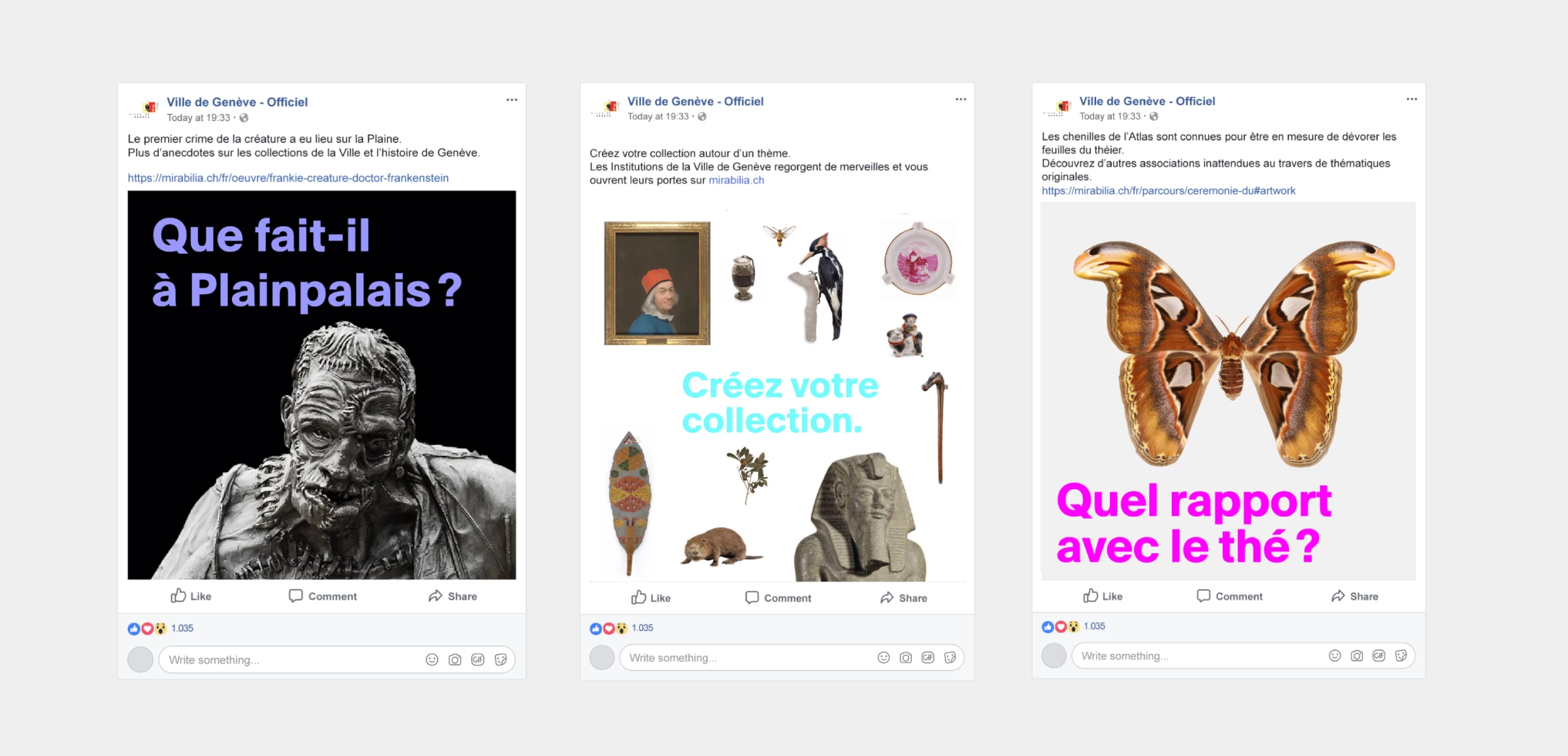 Mirabilia.ch est une plateforme web qui permet de découvrir les merveilles des musées de la Ville de Genève à travers des parcours thématiques et des anecdotes. L'utilisateur peut créer sa propre collection sur un thème et la partager. Cette campagne utilise le meilleur des réseaux sociaux pour mettre en avant les arguments différenciateurs de la plateforme.