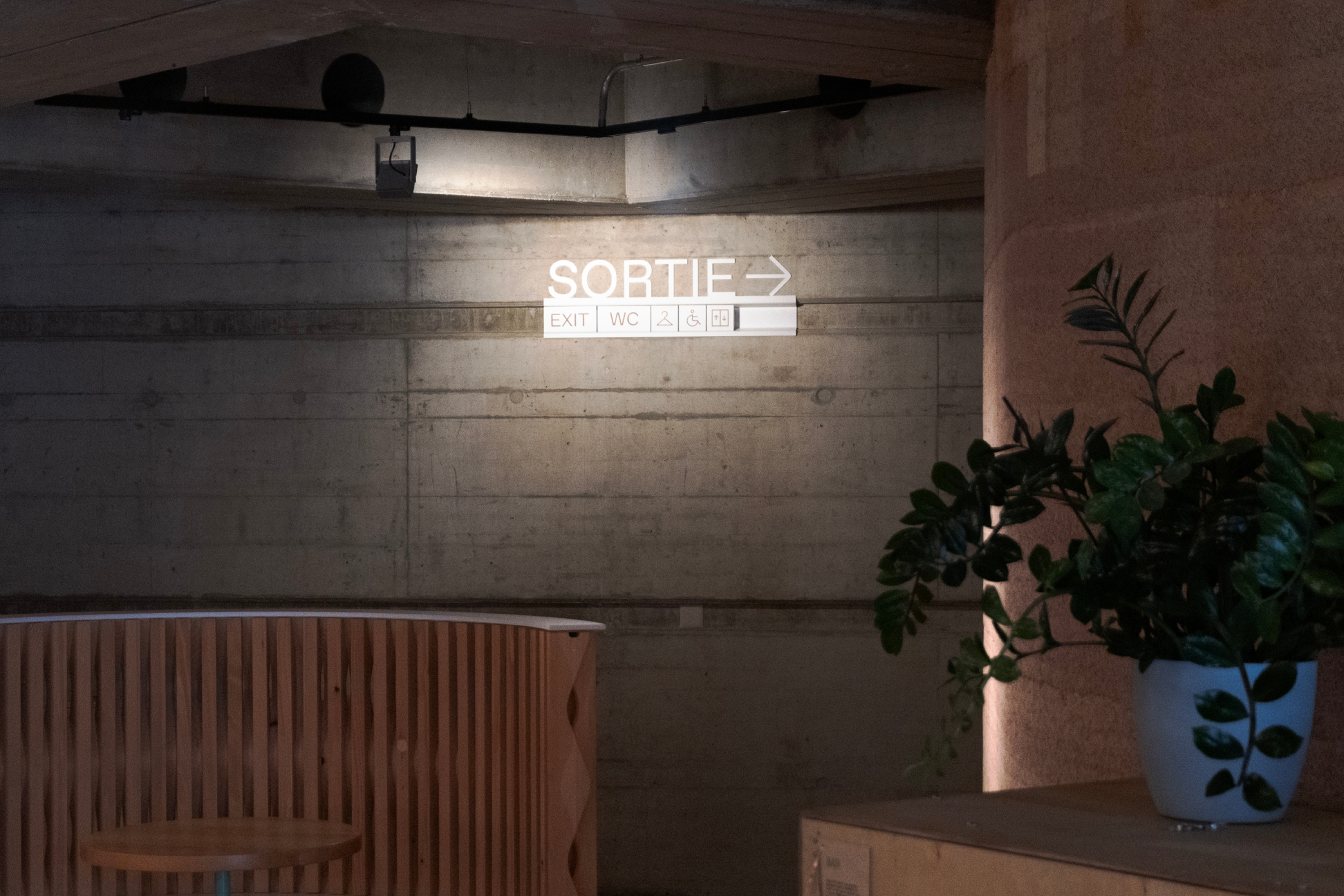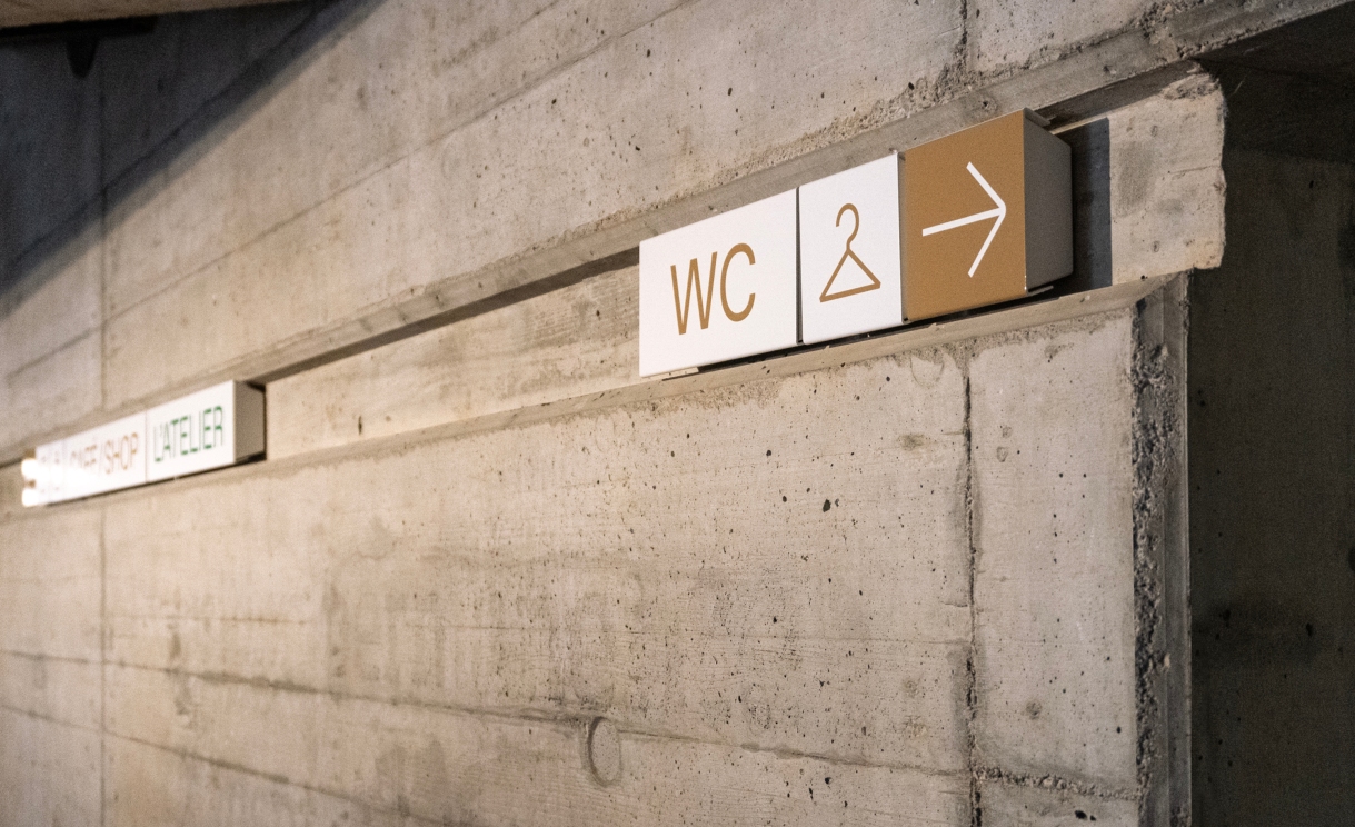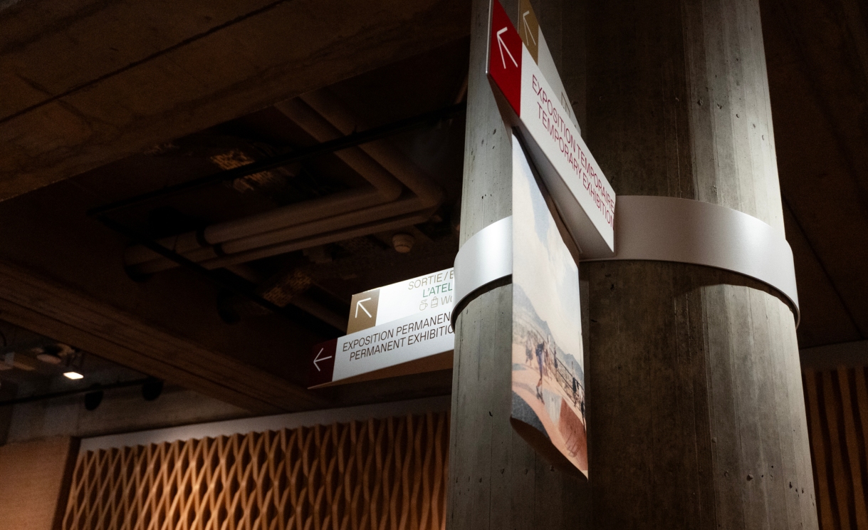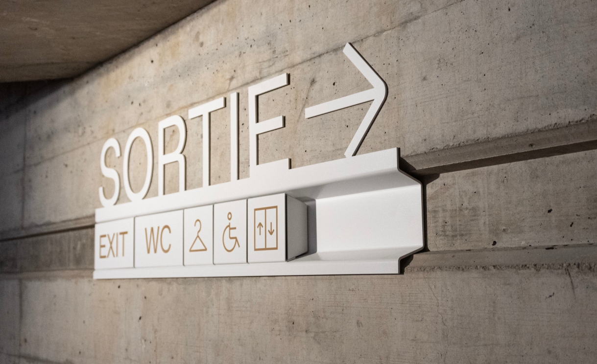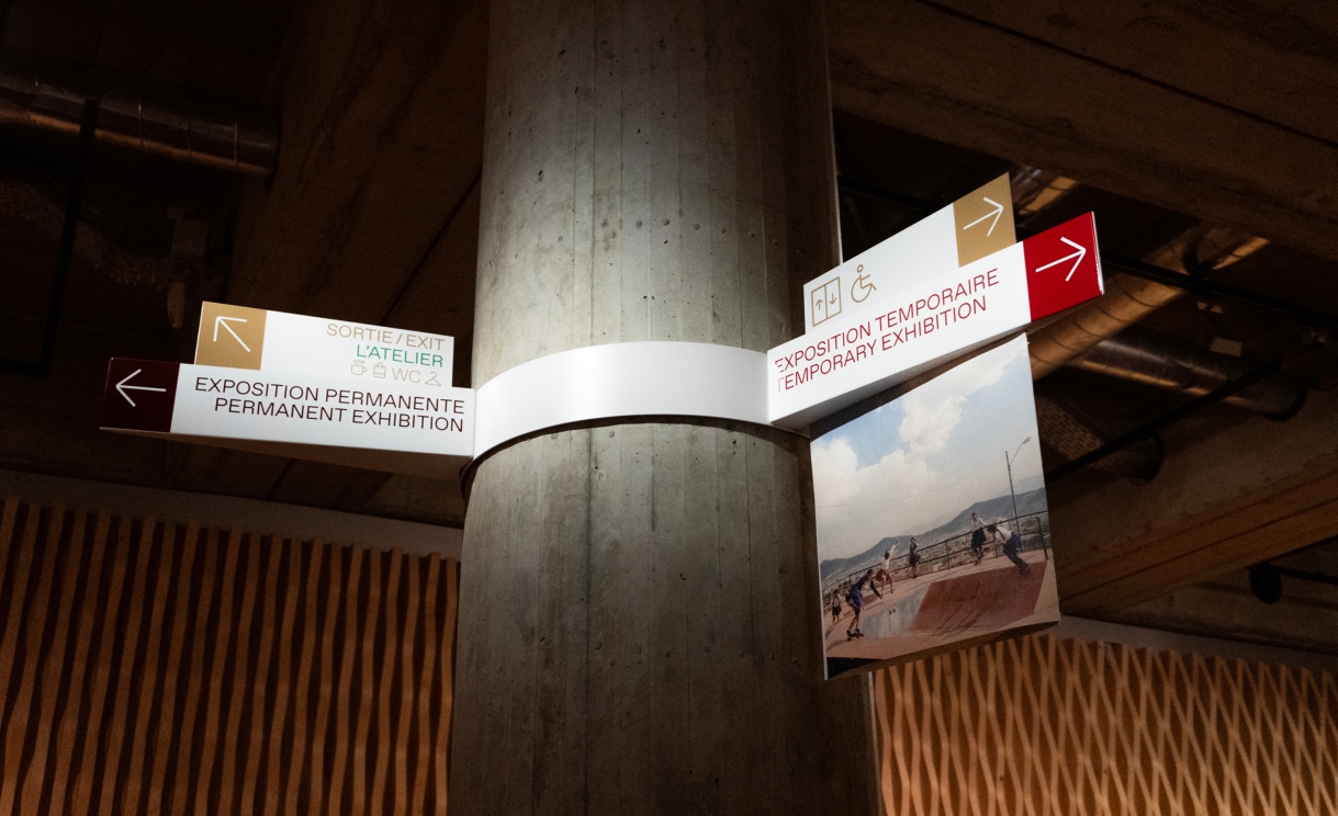 Notre intervention, basée sur les principes d'identification des drapeaux et étendards, vise à affirmer l’orientation des expositions tout en clarifiant la cohérence typographique et en organisant les contenus avec élégance. L’objectif est de composer avec les différentes strates informationnelles afin de neutraliser la diversité des signes existants, créant ainsi un système cohérent, intégré et efficace le projet s’insère dans l’espace sans imposer une nouvelle couche identitaire.