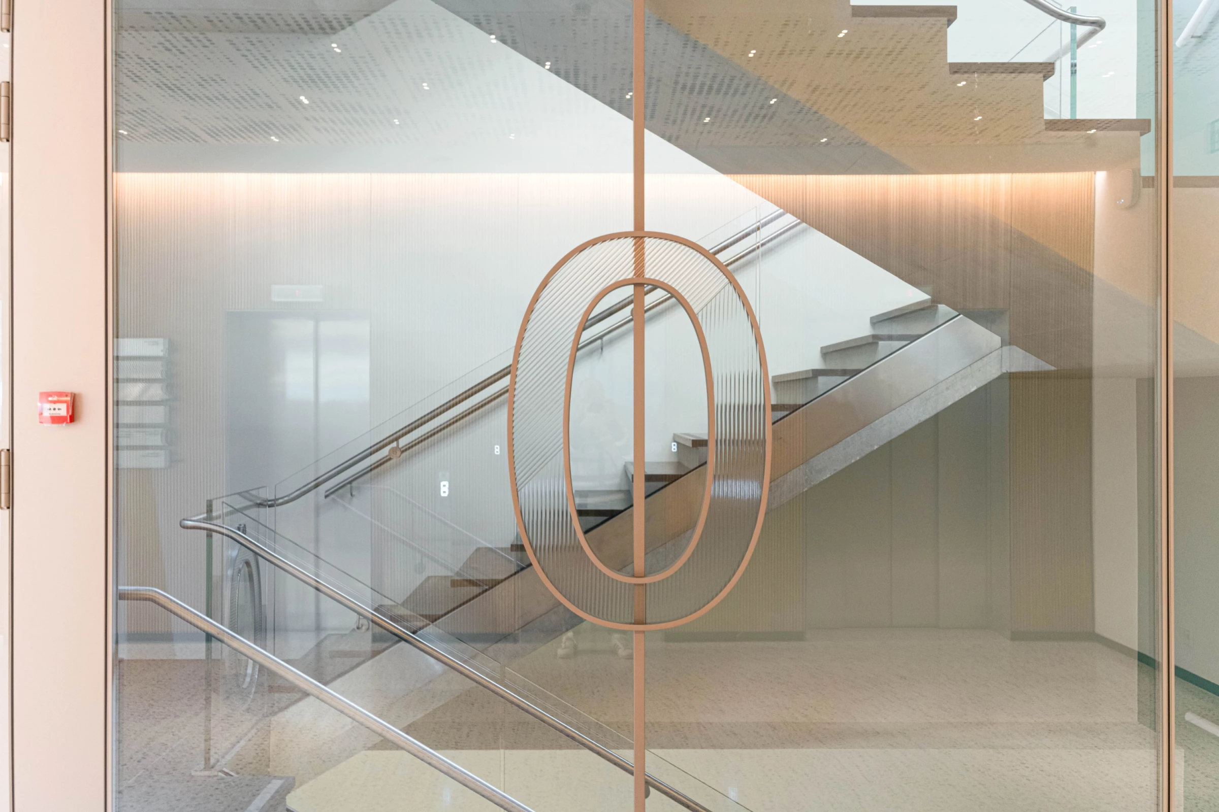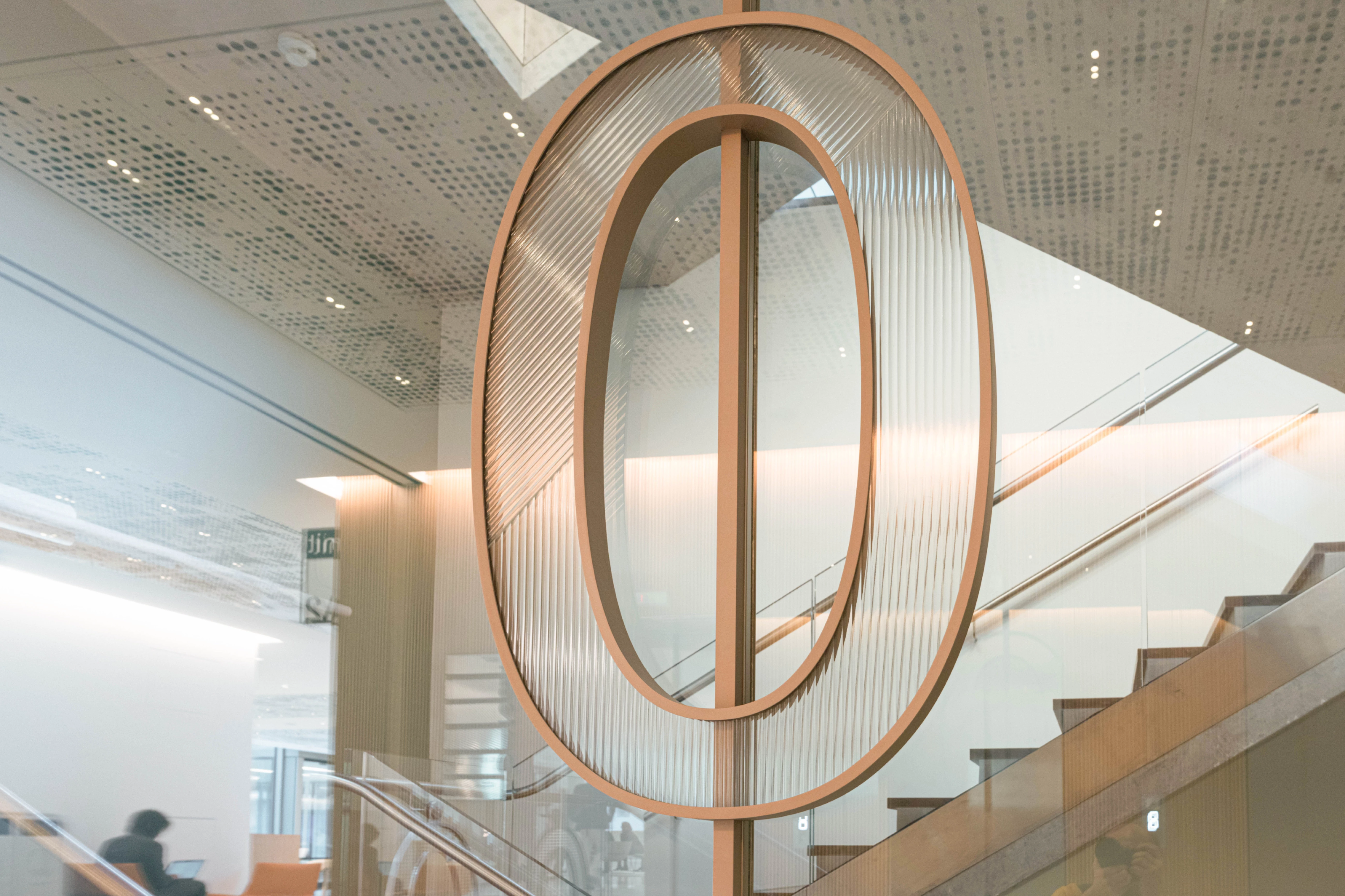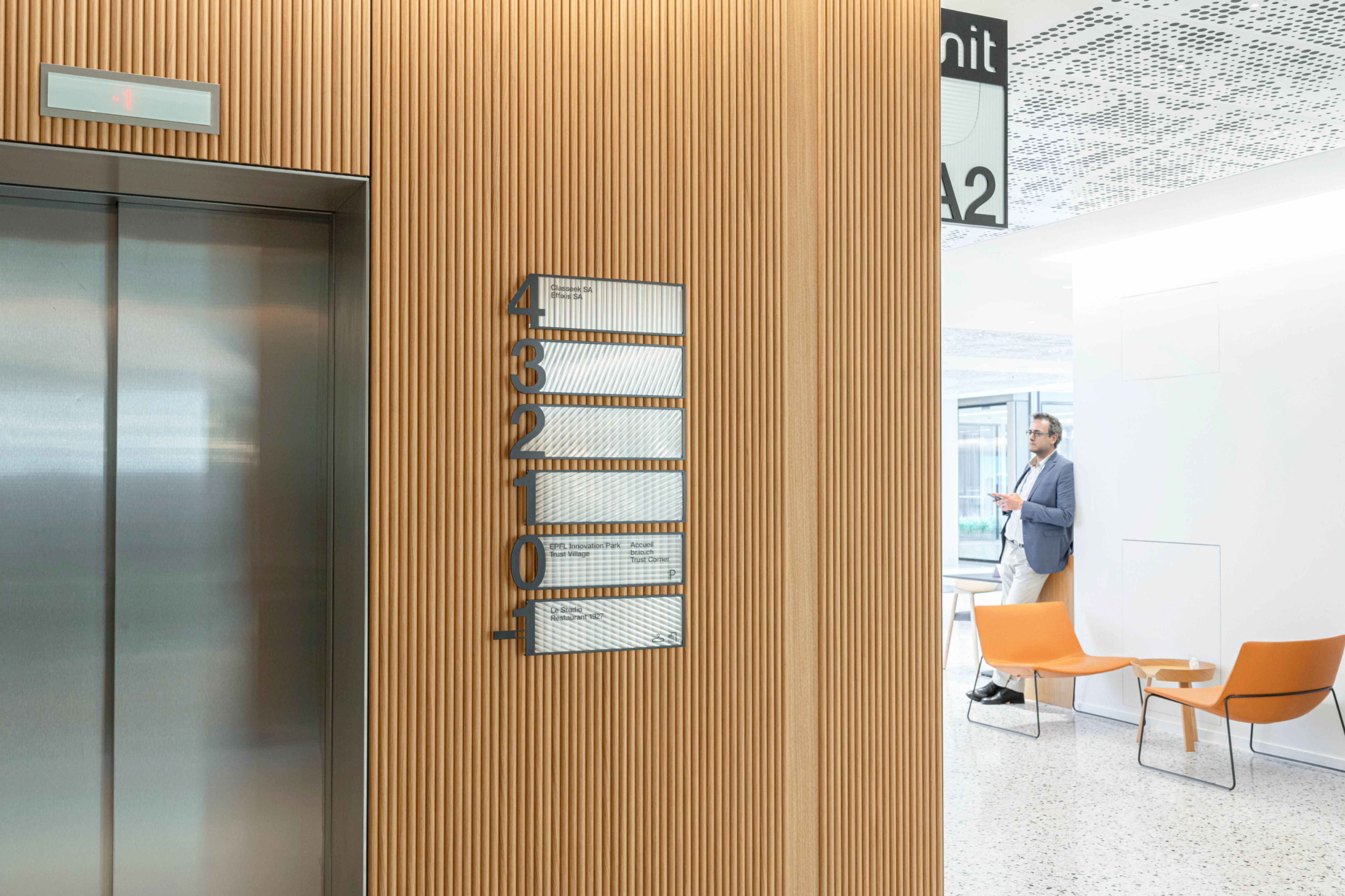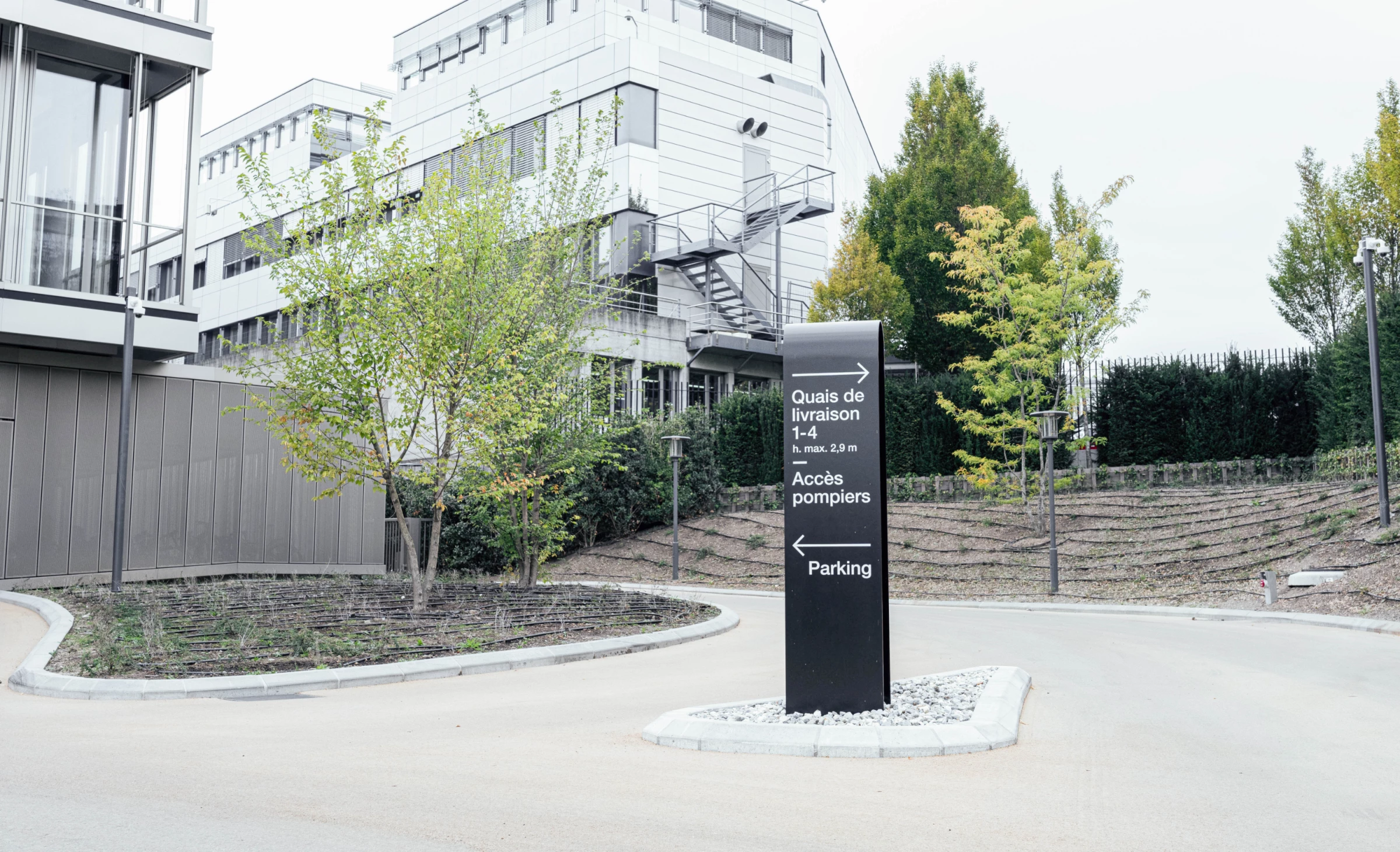 Notre agence a été retenue pour concevoir la signalétique de ce vaste ensemble qui comprend quatre immeubles reliés par un couloir intérieur appelé « la rue » . Nous nous sommes inspirés de ce concept architectural et des matériaux des bâtiments pour concevoir une grammaire visuelle particulièrement sensorielle. Des textures cannelées de verre acrylique sont juxtaposées pour créer des compositions aux opacités et aux rythmes variés.