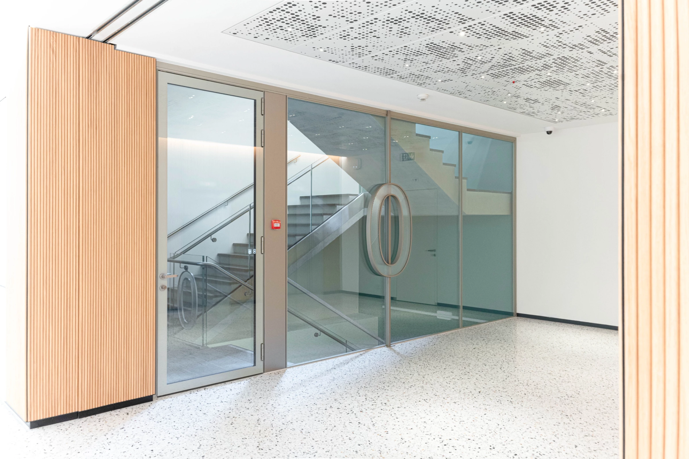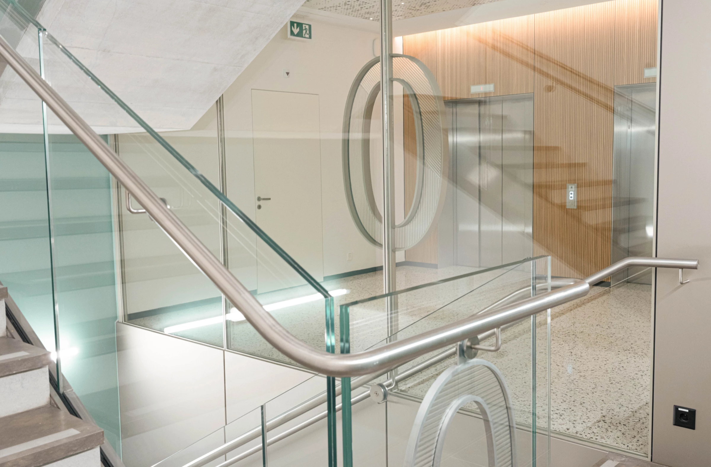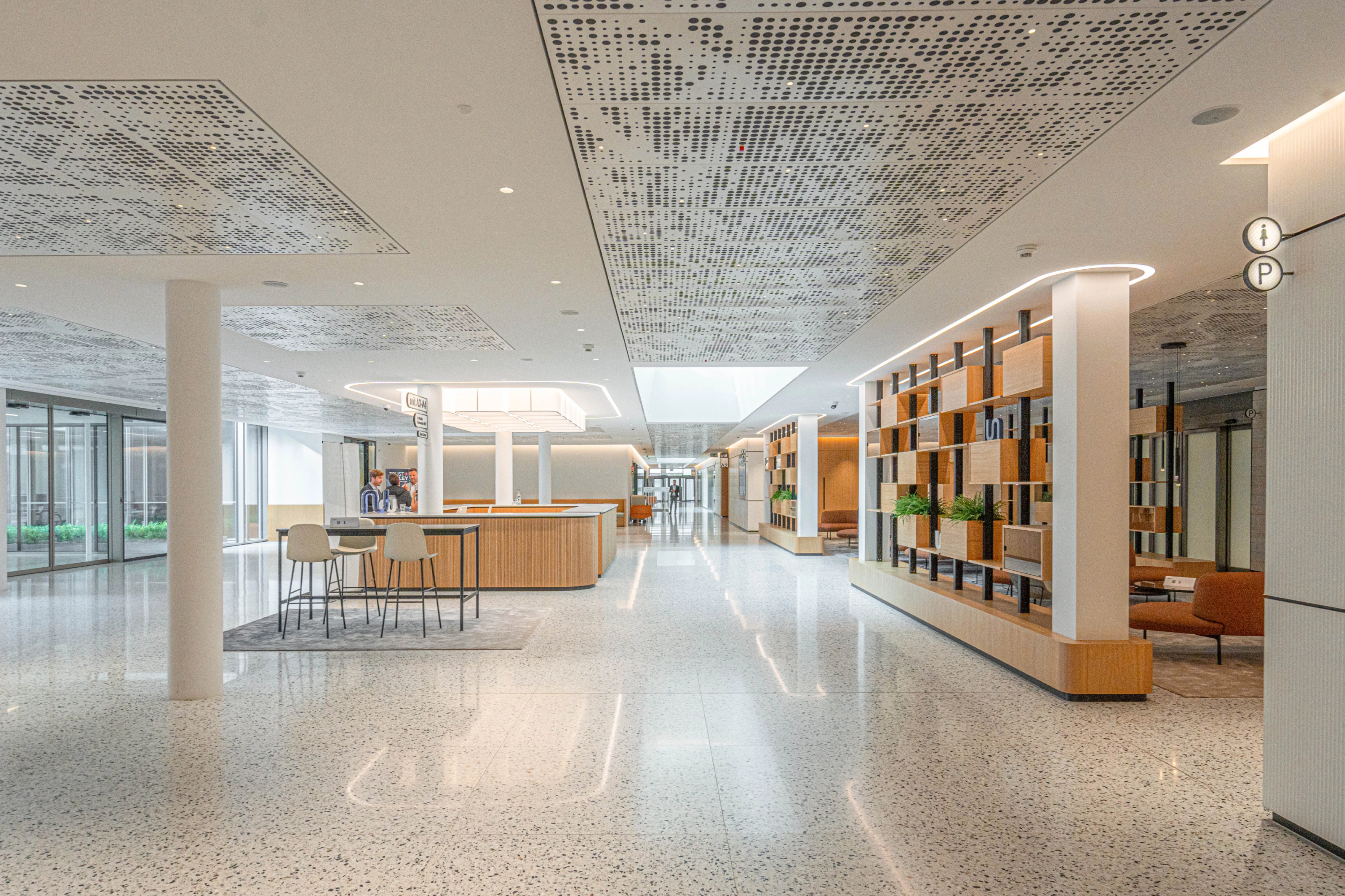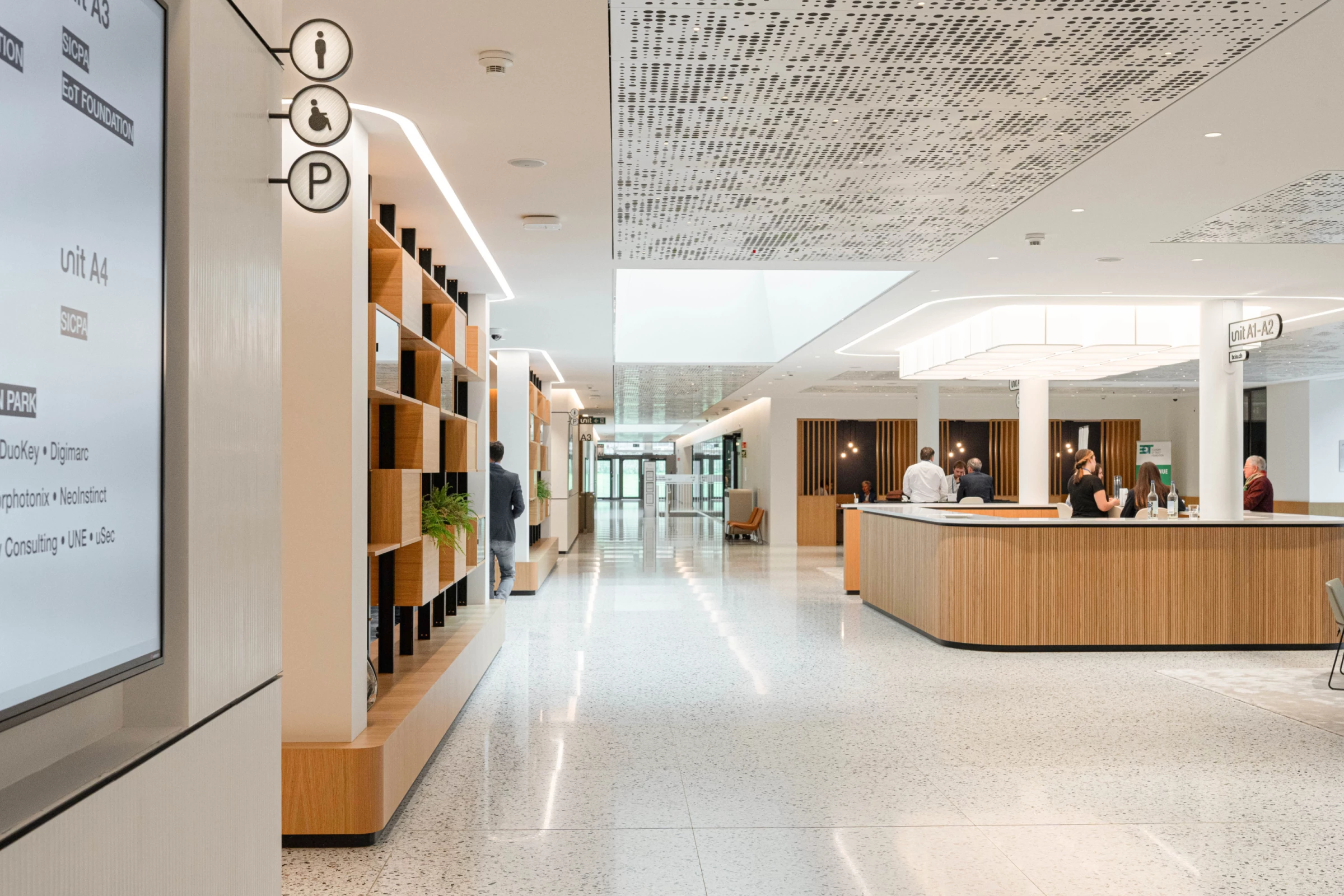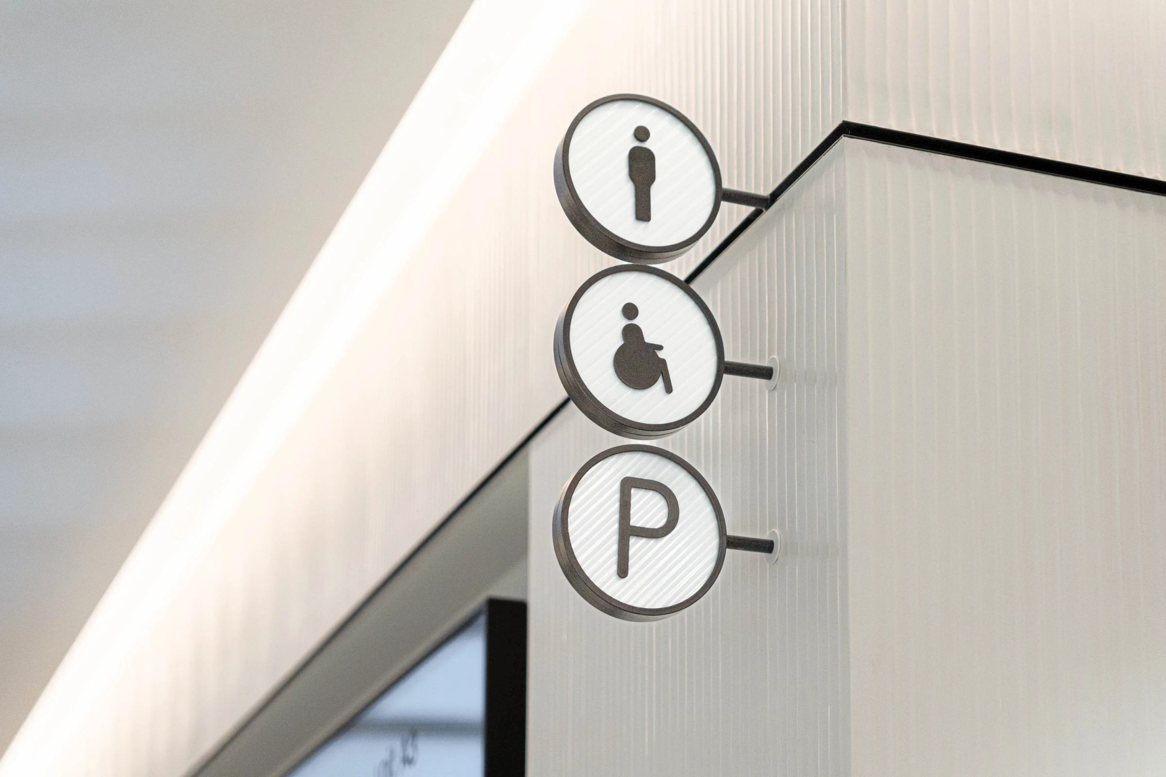 Notre agence a été retenue pour concevoir la signalétique de ce vaste ensemble qui comprend quatre immeubles reliés par un couloir intérieur appelé « la rue » . Nous nous sommes inspirés de ce concept architectural et des matériaux des bâtiments pour concevoir une grammaire visuelle particulièrement sensorielle. Des textures cannelées de verre acrylique sont juxtaposées pour créer des compositions aux opacités et aux rythmes variés.