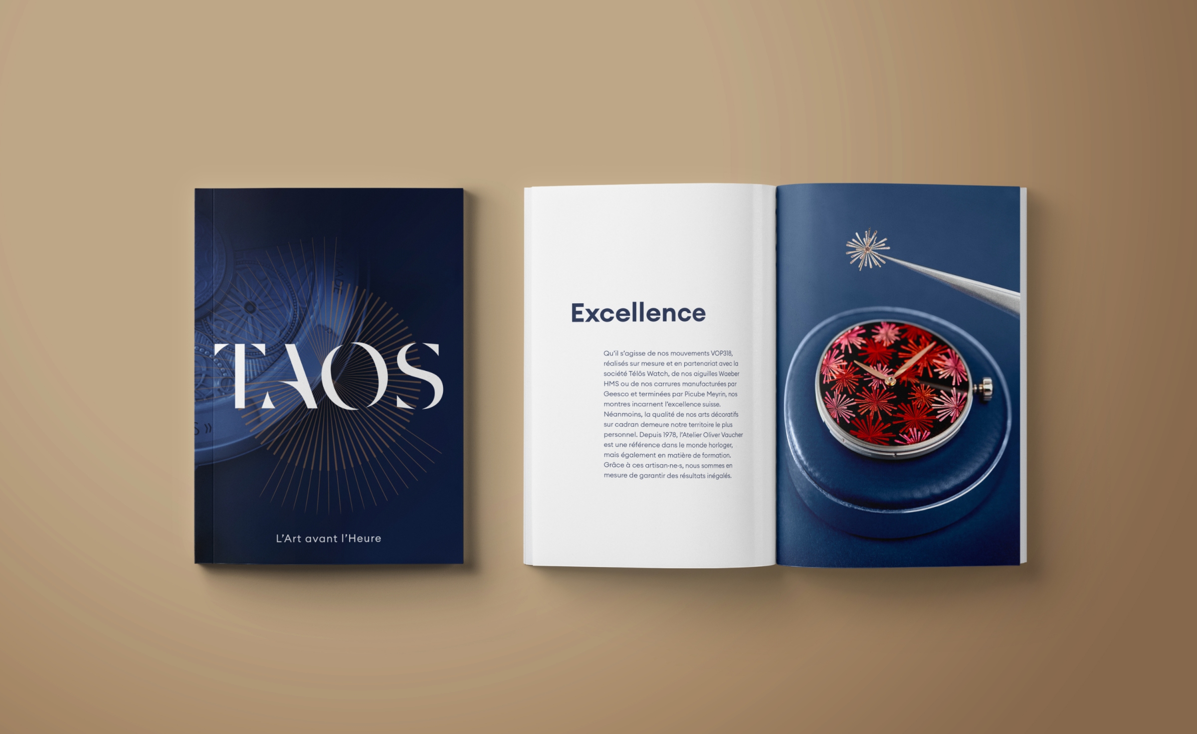 TAOS désigne le paon en grec ancien. Ce nom de marque, proposé par l’agence, nous semblait parfaitement adapté à une vision horlogère novatrice, tournée vers la création originale et l’artisanat d’excellence. Tout comme le paon déploie sa chatoyante beauté en faisant la roue, TAOS se distingue sur le marché par des cadrans d’une splendeur hypnotique et des mouvements finement ornementés à la main. Six pièces uniques qui sont de véritables œuvres horlogères, conçues et réalisées en Suisse par l’élite des maîtres artisans.