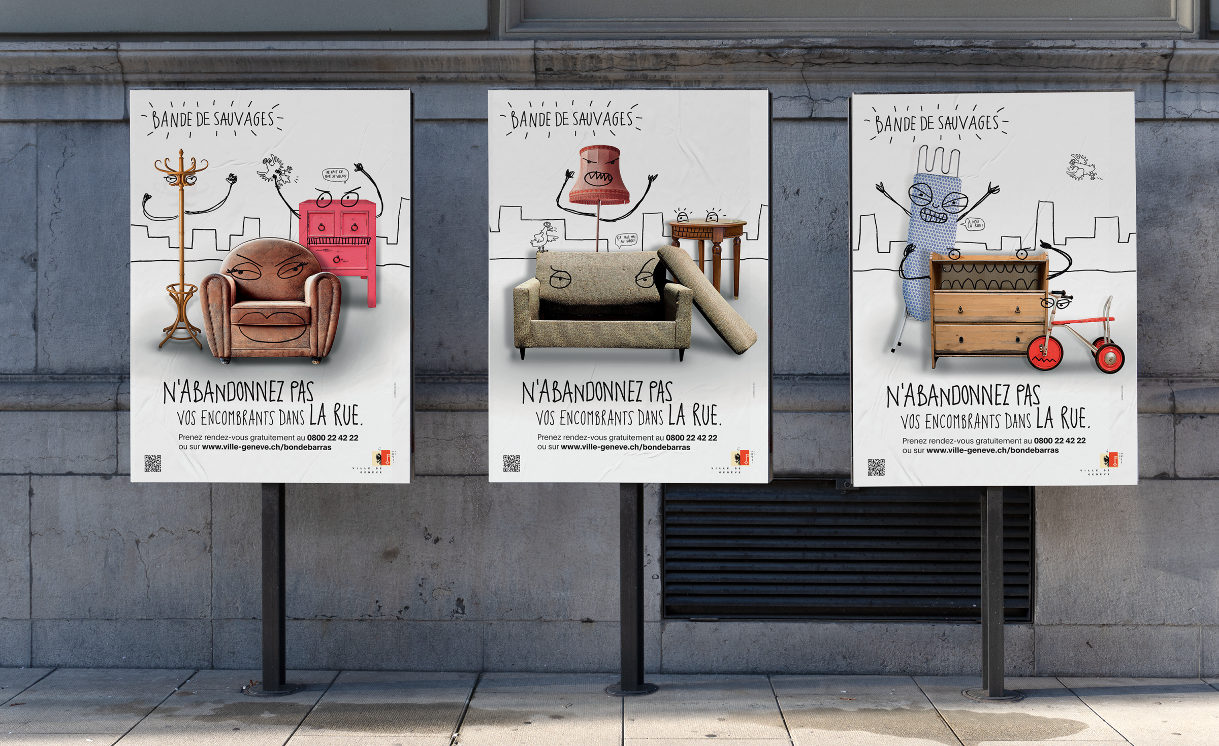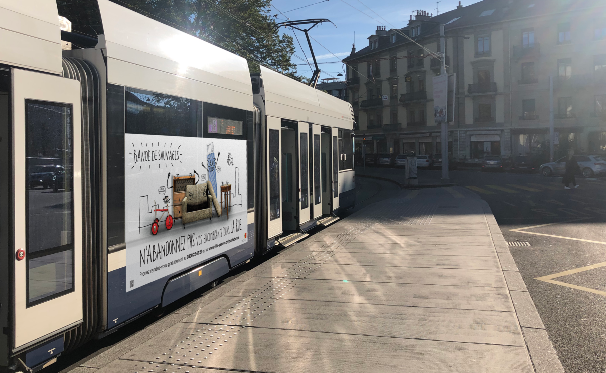 Le service Voirie de la Ville de Genève nous a mandaté pour réaliser la campagne contre les débarras sauvages. Le message: rappeler aux habitant-e-s qu'ils doivent obligatoirement prendre rendez-vous pour évacuer leurs encombrants et ne pas les abandonner dans la rue. La campagne d’affichage a été appuyée par une action de street marketing et de guérilla avec 5 installations réparties en ville de Genève.